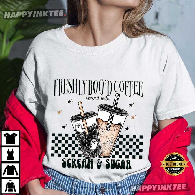 Get ready for some spooky vibes this season with our Freshly Boo’d Coffee Halloween T-Shirt!