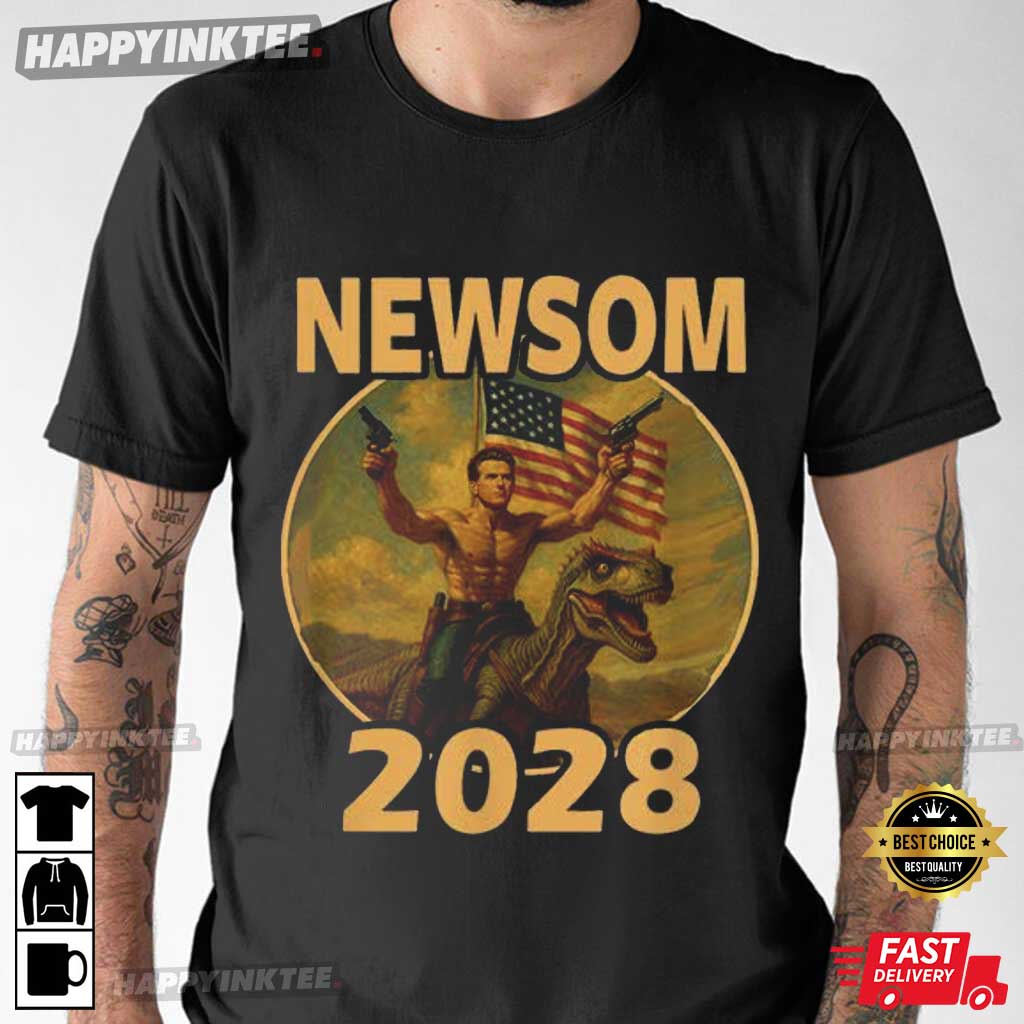 Gavin Newsom 2028 Bold Patriotic Leader Riding Dinosaur T-Shirt – t shirt printing, custom tee shirts
