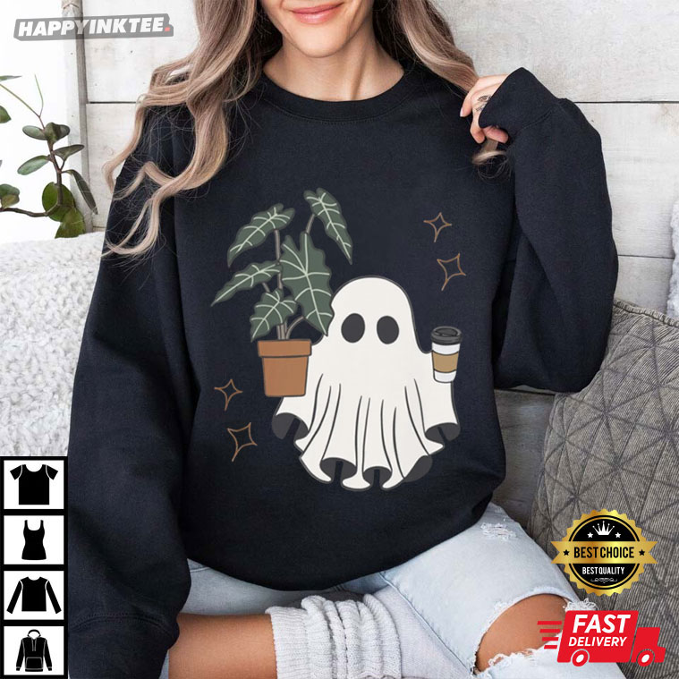 Get into the Halloween spirit with the Ghost Plant Coffee Spooky Halloween T-Shirt! It has an adorable ghost holding a potted plant and a coffee cup, mixing cozy fall vibes with a fun Halloween touch.