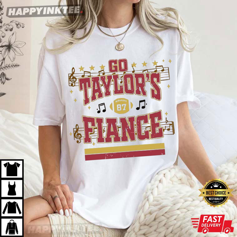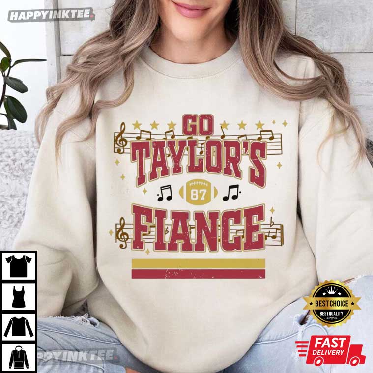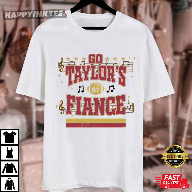With our Go Taylors Fiance Music Sheet Tayvis T-Shirt, you can sing it loud and be proud. This design combines the energy of game day with the vibes of Taylor Swift for the ultimate fan crossover. It has big red and gold letters, fun music notes, and Kelce’s number 87 inside a football image.