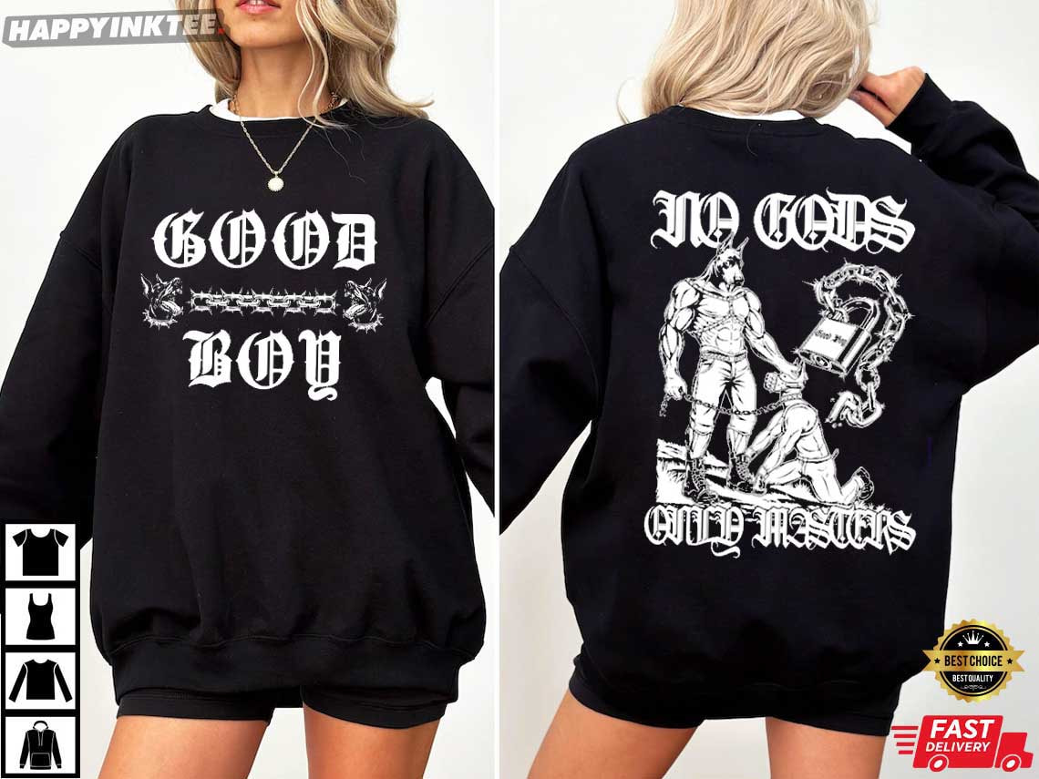 Bold, dark, and unapologetically expressive, the Good Boy No Gods Only Masters Gothics T-Shirt combines a raw visual aesthetic, strong symbolism, and gothic typeface to appeal to everyone who enjoys alternative culture. This powerful illustration channels themes often found in gothic art, metal culture, and underground aesthetics: rejecting imposed authority, questioning hierarchy, and choosing one’s own path.