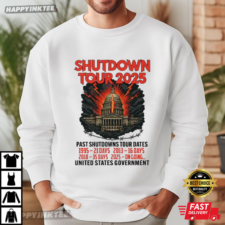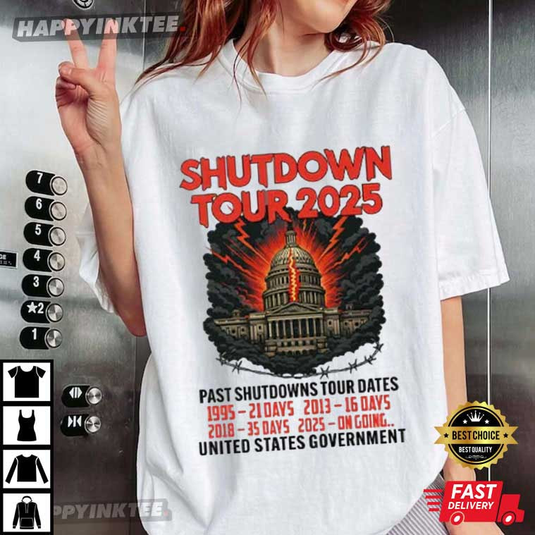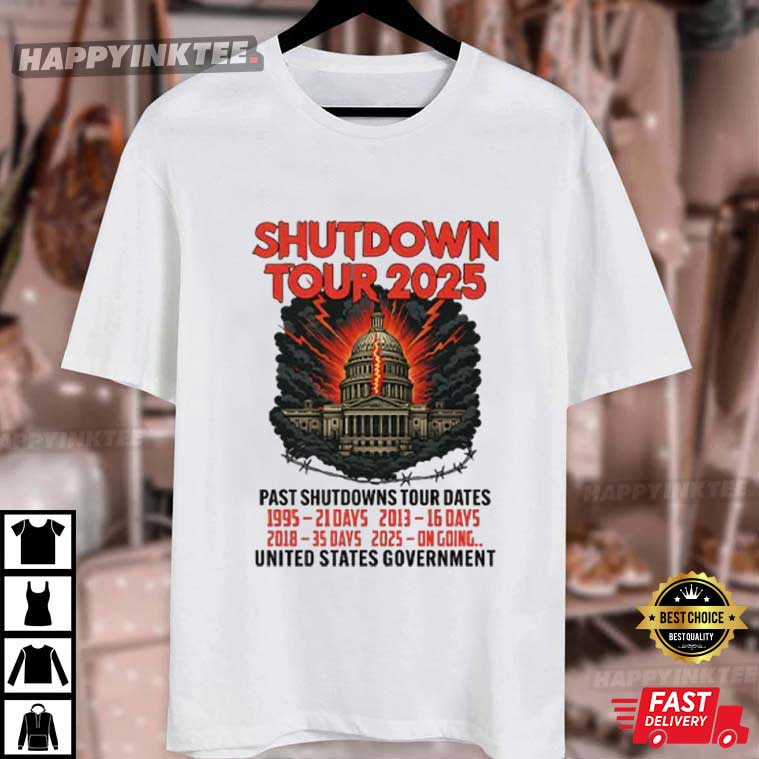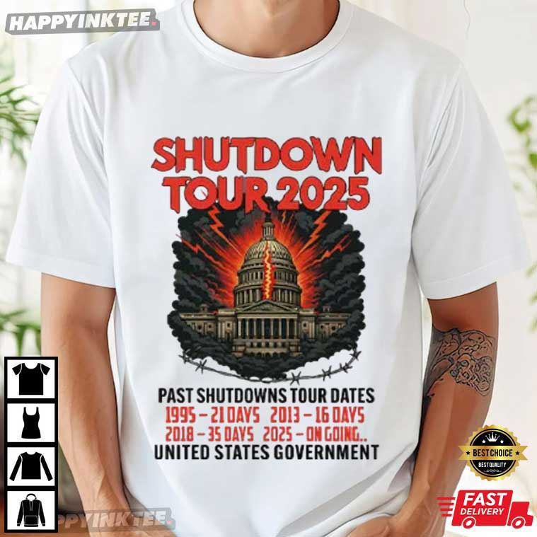 Government Shutdown Tour 2025 Past Shutdowns Tour Dates T-Shirt – graphic t shirts vintage, retro graphic t shirts, unique graphic t shirts, retro tee shirts, vintage 80s t shirts, custom apparel
