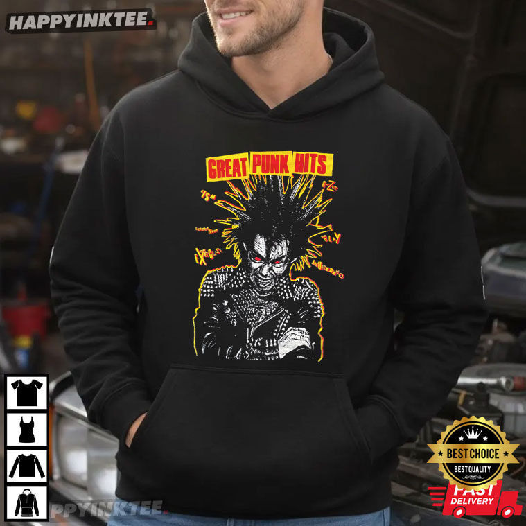 With our Great Punk Hits Gism Laughin Nose Jap Punk T-Shirt, turn up the volume and show off the unadulterated energy of Japanese punk. This bold design pays homage to the legendary Jap-punk scene with a fierce, high-contrast graphic featuring a snarling, spike-haired punk icon straight out of the underground. The bright yellow and red “GREAT PUNK HITS” banner at the top screams classic compilation album vibes, around the primary image, chaotic lightning bolts and band names like GISM, Laughin Nose, and others explode.
