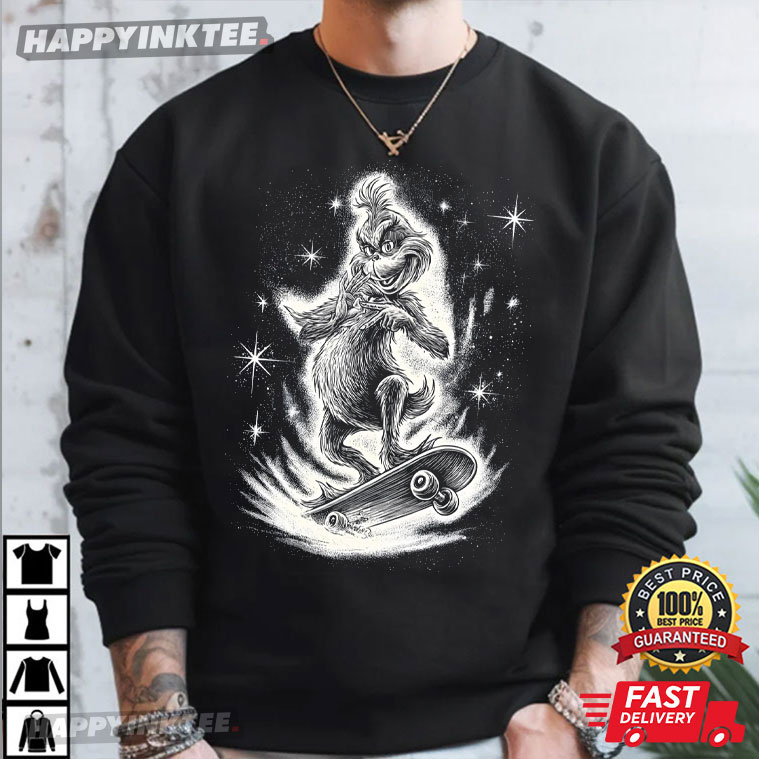 This Grinch Six Seven Meme Mean Guy Christmas T-Shirt is the best choice for the season if you like to mix classic holiday fun with internet humor. There is a hand-drawn starry effect around a Grinch-like creature who is executing a daring skateboard trick. It merges the old-school Christmas emblem with the viral “Six Seven” / “6 7” meme energy that’s been spreading all over TikTok and meme culture this year.