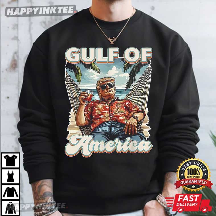 The Gulf Of America Trump Beach T-Shirt features a fun illustration of President Donald Trump chilling in a hammock on the beach. This imagery gives off a chill vibe, maybe hinting at a “presidency vacation” or just a fun look at political figures kicking back and enjoying some free time.