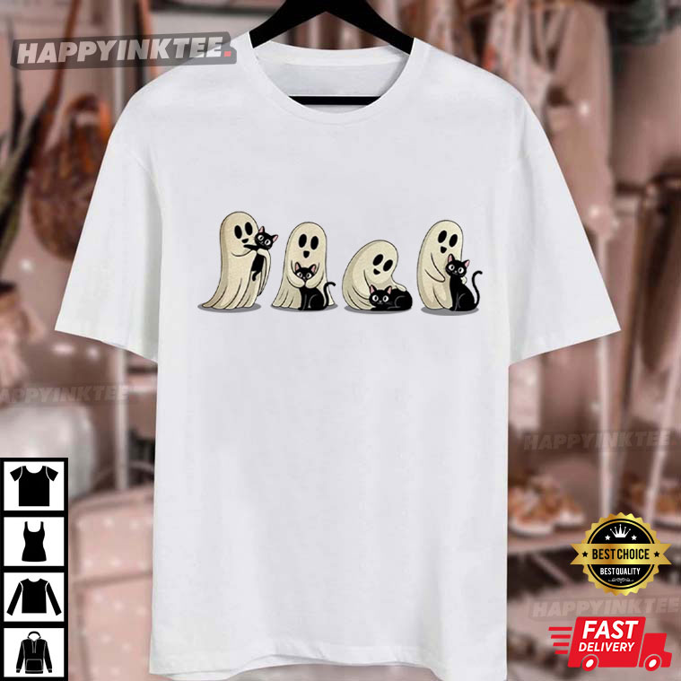 Our Halloween Spooky Ghost and Cat T-Shirt will help you get ready for the spooky season and all the comfortable vibes that come with it. It displays four separate scenes of pleasant ghosts and small black cats hanging out together. The pictures of ghosts snuggling, holding, and hanging out with their cat friends are so sweet and heartwarming.