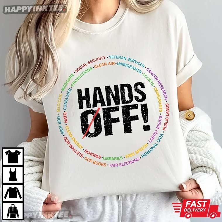 “HANDS OFF!” serves as a rallying cry, demanding that these listed areas—spanning social services, environmental concerns, personal rights, and democratic principles—be protected from interference, likely by government policies, corporate interests, or other entities.