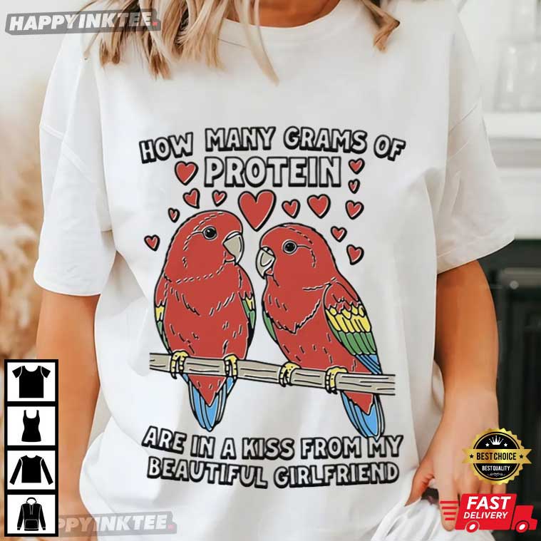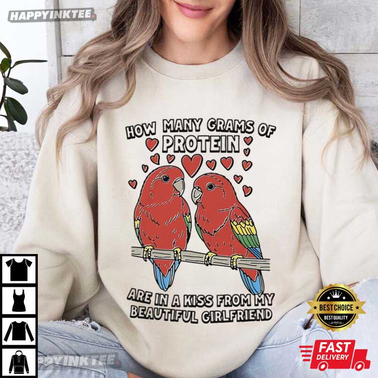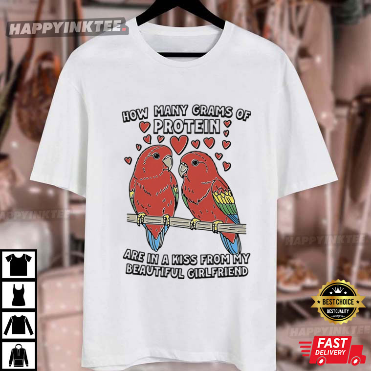 Spice up your wardrobe with this How Many Grams Of Protein Are In A Kiss From My Beautiful Girlfriend T-Shirt! It has two cute lovebirds and some hearts, mixing fitness jokes with a sweet message for your girlfriend: “How many grams of protein are in a kiss from my beautiful girlfriend?” It totally combines love and laughter, making it a romantic gift for girlfriend or anyone who gets a kick out of fitness jokes.