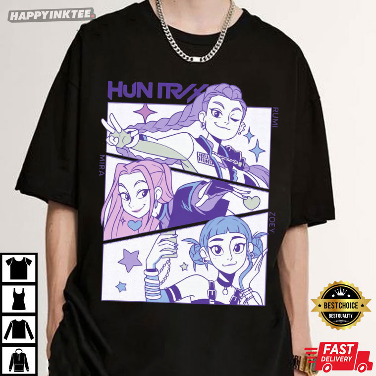 Huntrix Kpop Demon Hunters Merch T-Shirt is all about honoring the path of the Huntrix member. The “Demon Hunters” theme really gets that edgy atmosphere right by combining Kpop’s infectious sounds with a great mythological warrior aura. It portrays the Huntrix members, the charming idol whose unique style and spectacular performances make them the exciting star of this fan-favorite clothing.