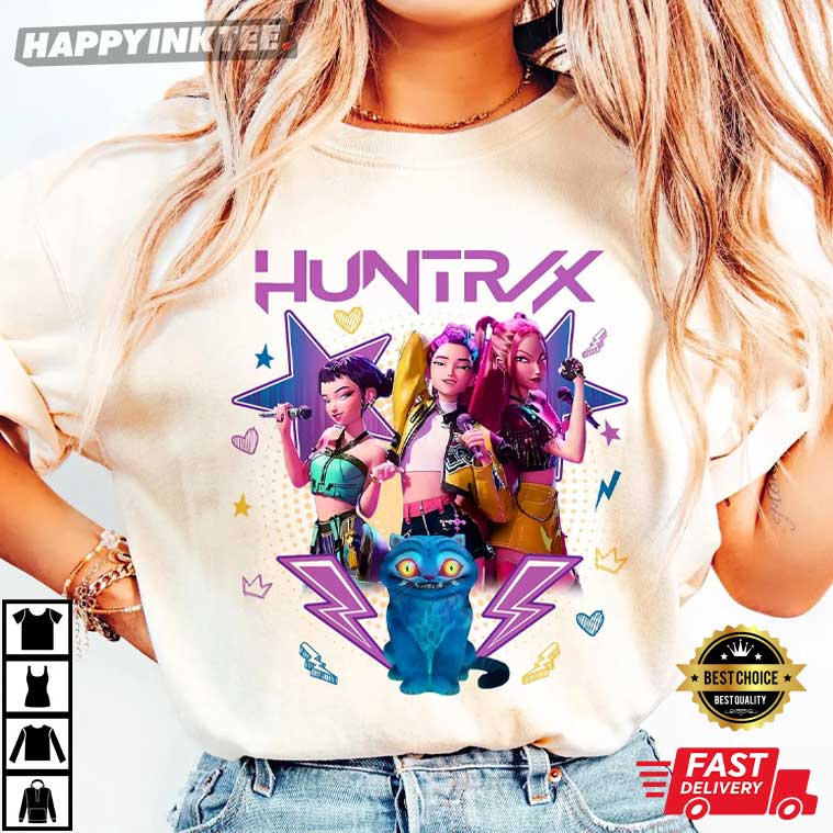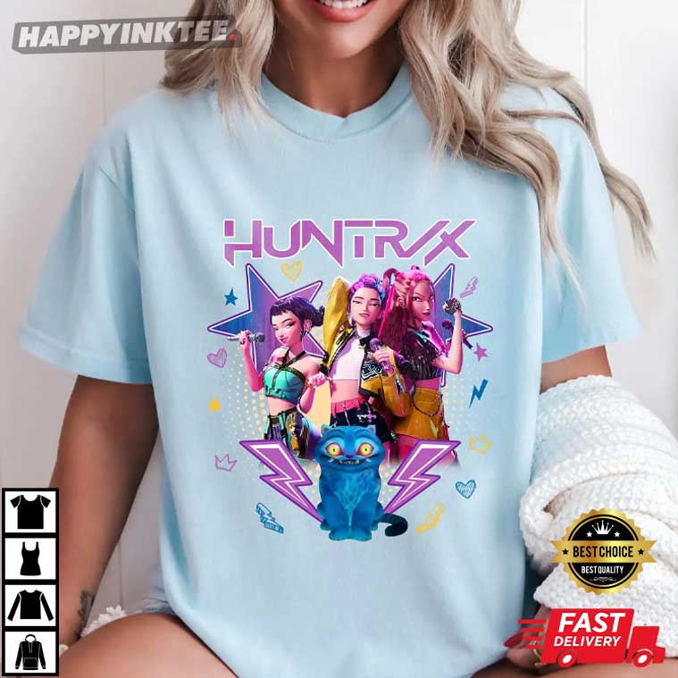 The artwork shows Mira, Rumi, and Joey posing confidently with microphones, totally owning their vibe and musical energy. Surrounded by cool electric stars, lightning bolts, and fun hearts, this Huntrix fan shirt mixes Kpop glam with a fantasy hero feel. And the cute blue tiger shows up too—bringing some fun to the whole fierce vibe.