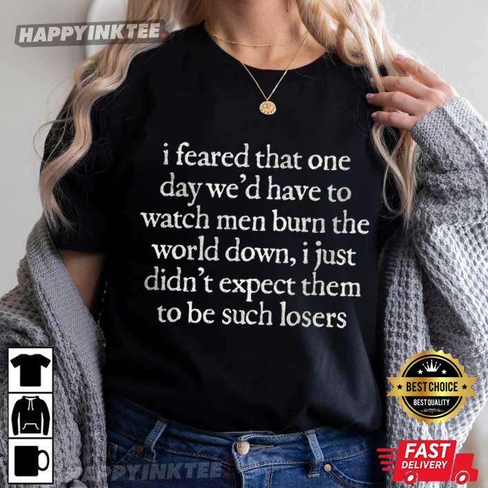 This I Feared One Day We’d Have To Watch Men Burn The World Down T-Shirt is bold, funny, and has a bit of an edge—it totally captures what a lot of people are already feeling. It has the phrase “I feared that one day we’d have to watch men burn the world down, I just didn’t expect them to be such losers,” mixing some serious social commentary with a sarcastic twist that really stands out.