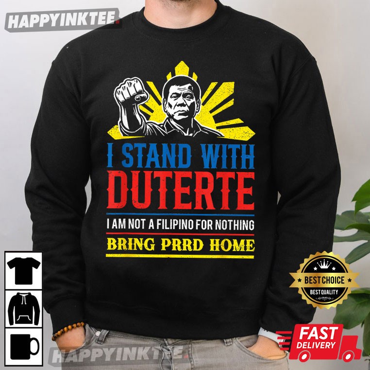 Wearing the I Stand With Duterte Bring PRRD Home Politics T-Shirt will demonstrate your steadfast support! Designed for loyal supporters of former President Rodrigo Duterte, this bold statement tee features eye-catching typography and a patriotic design. Featuring bold typography and a patriotic theme, this shirt is perfect for rallies, political events, or simply showing your loyalty to PRRD.