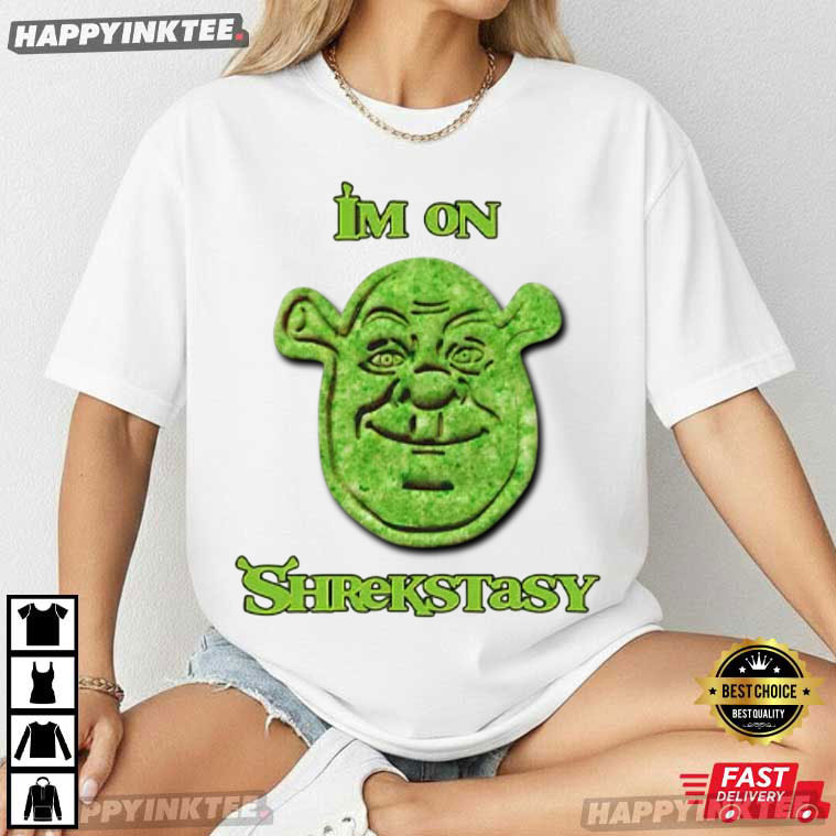 Front and center is a stylized green ogre face that instantly reminds fans of that legendary animated character we all grew up with. The exaggerated expression gives it a slightly trippy, surreal vibe—ideally complementing the lighthearted expression “I’m On Shrekstasy.”