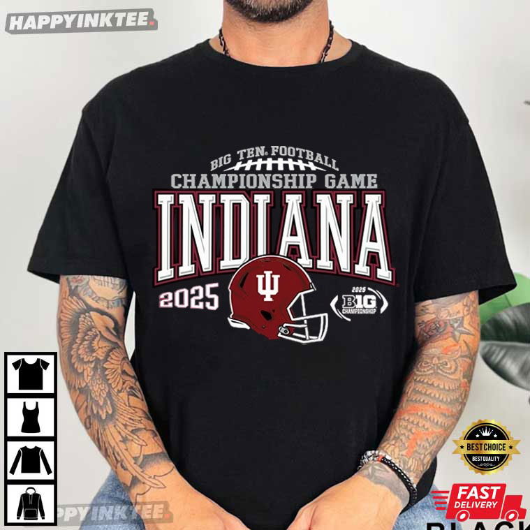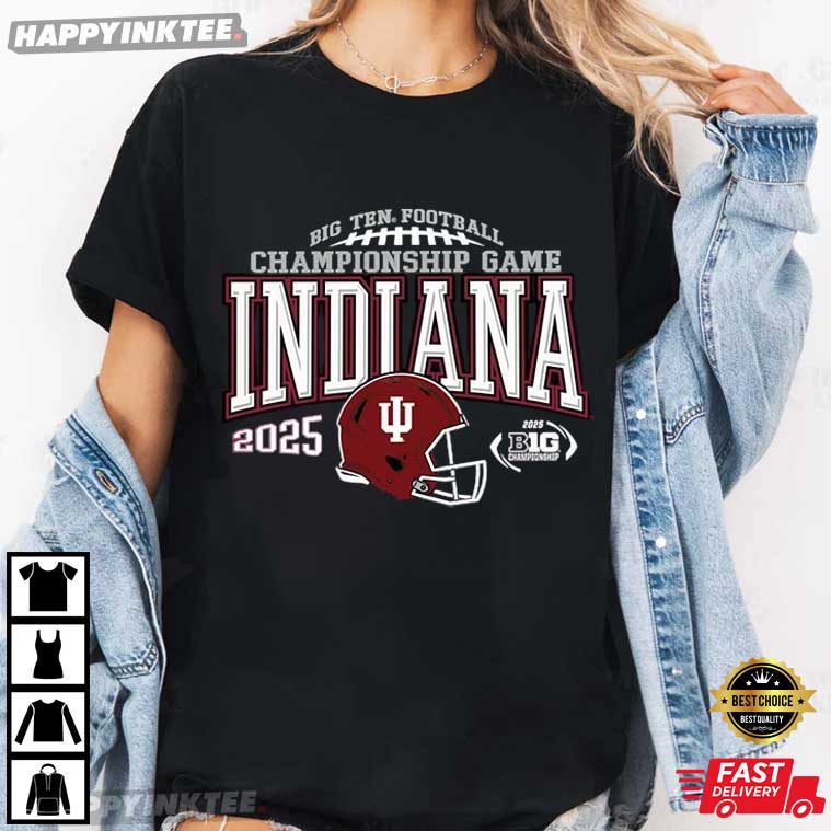 The main focus of the design is “INDIANA” in big college letters, together with a traditional Hoosiers football helmet with the famous IU insignia on it. The writing above it, “Big Ten Football Championship Game,” underscores the accomplishment, and 2025 will be a year that fans will always remember. The design is like real championship merchandise, so it looks official, ageless, and ready for game day.