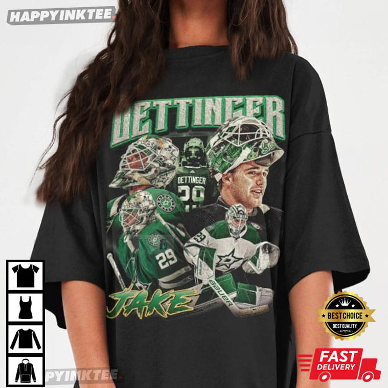 Designed for NHL’s rising goaltender, this Jake Oettinger vintage hockey T-shirt will help you to show your Dallas Stars pride! Both die-hard fans and hockey lovers should acquire this retro hockey tee, which has a bold 90s bootleg-style collage of Oettinger in action.