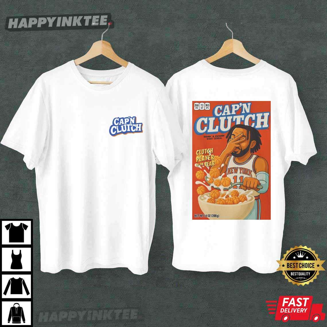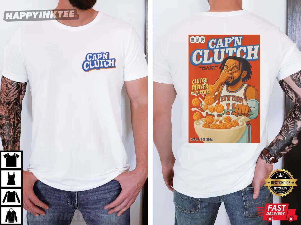 The cereal box design on this Jalen Brunson Knicks Captain Cap’n Clutch T-Shirt playfully alludes to his leadership: Brunson as the “captain” driving the squad, with basketballs as cereal to represent his game-changing actions. For Knicks supporters who saw him as a franchise cornerstone, this Jalen Brunson Apparel is a fun tribute.