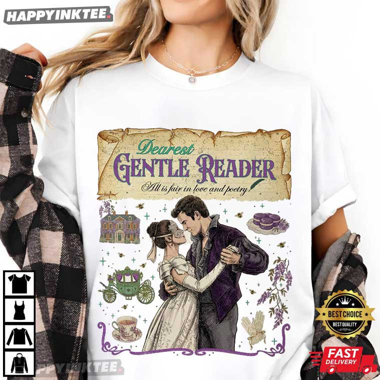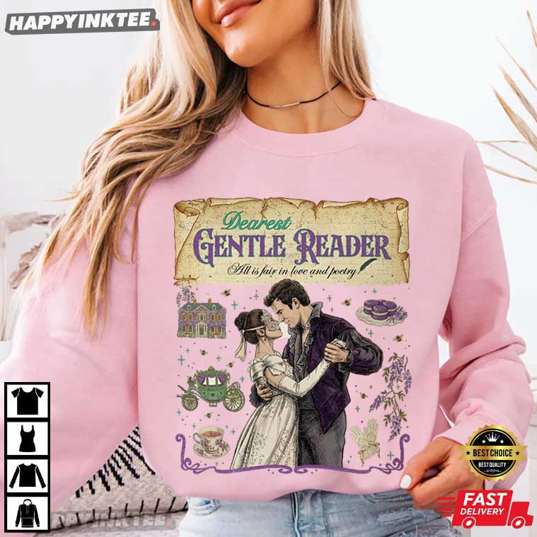 The Jane Austen Dearest Gentle Reader Regencycore Wisteria Floral T-Shirt is a charming tribute to the elegance, romance, and timeless storytelling of classic Regency-era literature — Featuring a beautifully illustrated couple dancing beneath a vintage parchment-style banner reading “Dearest Gentle Reader – All is fair in love and poetry,” the charming ambiance of ancient romance and elegant social events is captured in the design.
