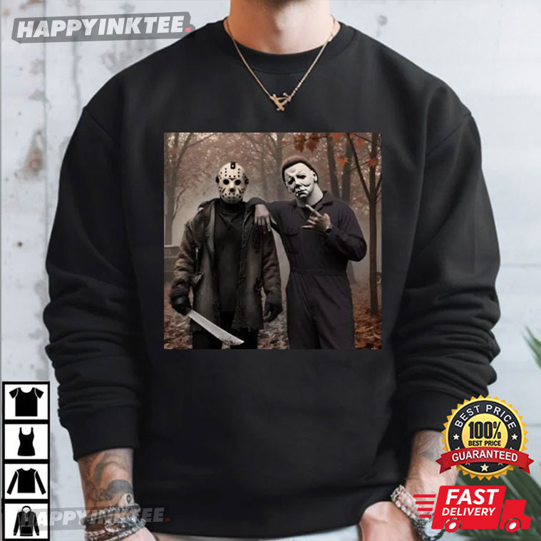 Two horror legends. One chilling shirt. This Jason Voorhees Michael Myers Friday The 13th Halloween T-Shirt brings together two of the most legendary slashers in film — the quiet terror from Friday the 13th and the relentless figure from Halloween.