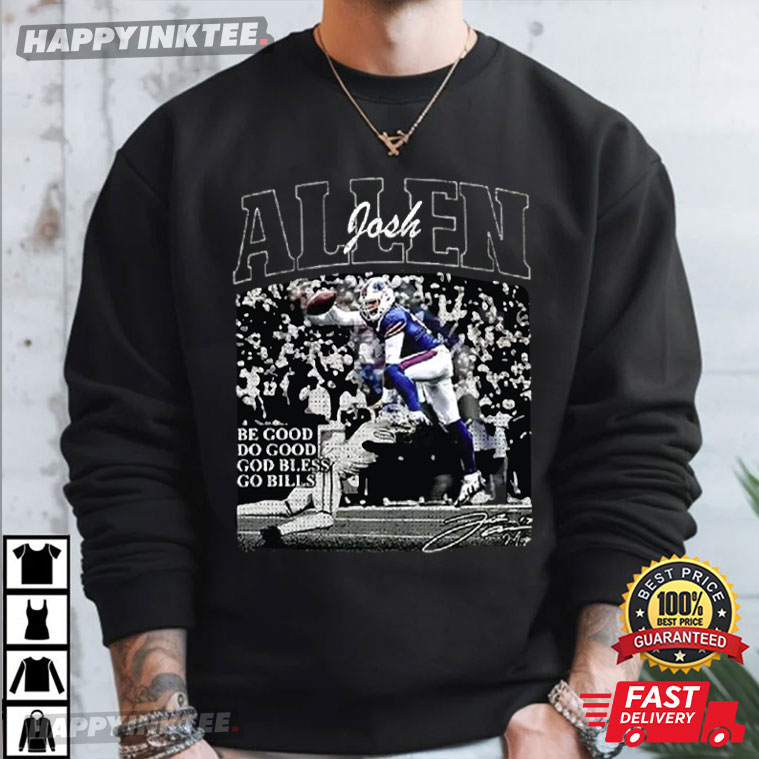 Rep your team with the Josh Allen Be Good Do Good Buffalo Bills Vintage T-Shirt. This Buffalo Bills Mafia apparel has a cool graphic of the star quarterback in action, plus his awesome quote “Be Good, Do Good, God Bless, Go Bills.” It’s a must-have for any Bills Mafia fan!