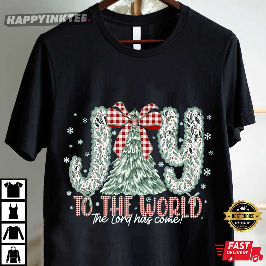 Bring holiday cheer and faith together in this beautifully festive Joy to the World The Lord Has Come Bow Christmas T-Shirt.