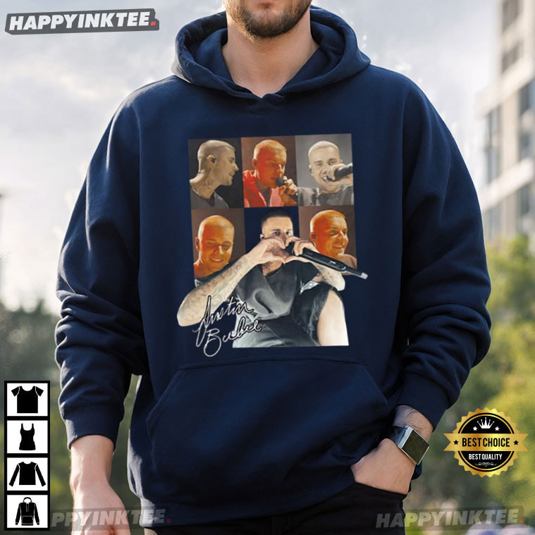 Wear this Justin Bieber Heart Sign Coachella 2026 Music T-Shirt to represent the King of Pop in his purest form — This bold black tee features a striking 2×3 photo collage that captures Justin Bieber across different eras and moods—from the clean-cut look to the tattooed, high-energy stage moments. In the bottom panel, he is seen clutching the microphone and tossing up his trademark heart hands, along with his recognizable white script signature.