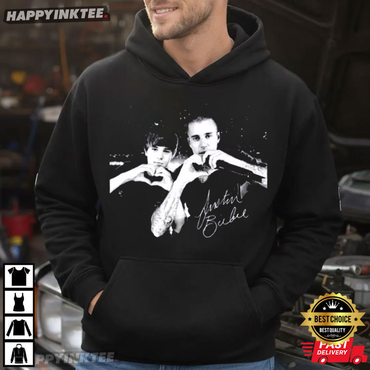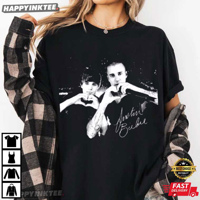 Show your love for the one and only Justin Bieber with this exclusive Justin Bieber Heart Sign Coachella Tour 2026 Music T-Shirt — The bold black-and-white graphic captures a classic moment of Bieber and a young fan both throwing up heart hands—an ideal representation of the relationship between the artist and his devoted followers.