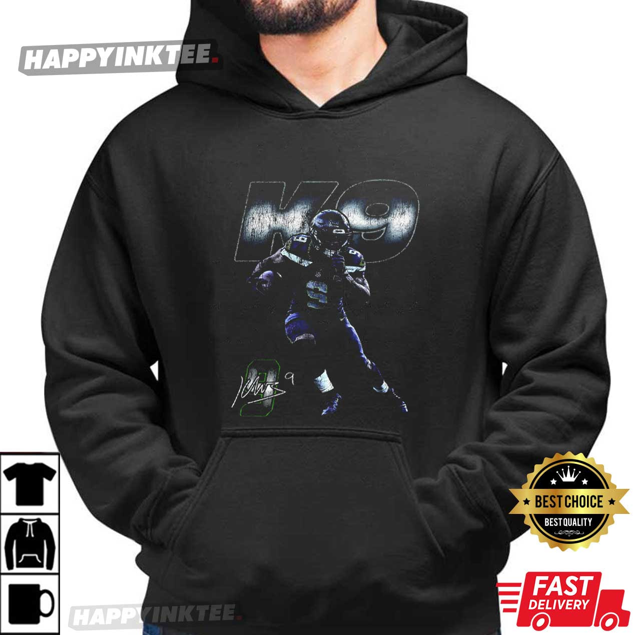 This Kenneth Walker III shirt features a bold graphic of Kenneth Walker III, Seattle’s standout running back known by fans as “K9”, powering through defenders in classic throwback style —The large player image, crisp number 9, and authentic Seattle Seahawks color scheme make this design perfect for game days, tailgates, or everyday fan wear.