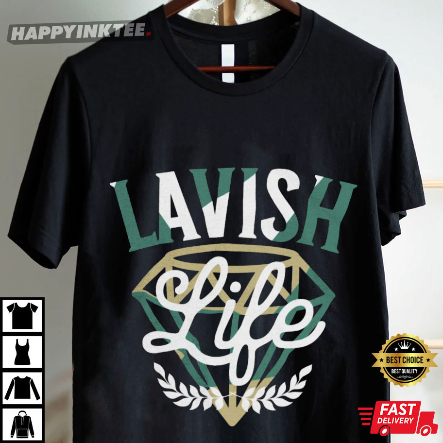 The Lavish Life Nike Air Diamond Turf Emerald Sneaker Matching T-Shirt is made to perfectly complement your Emerald Diamond Turf kicks. It has a cool diamond emblem, fancy script, and stylish green-gold accents for a fresh, coordinated vibe.