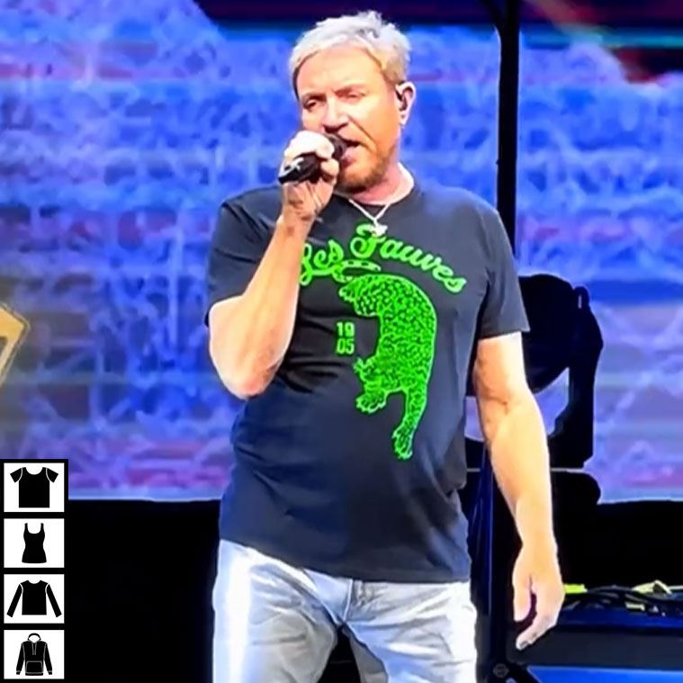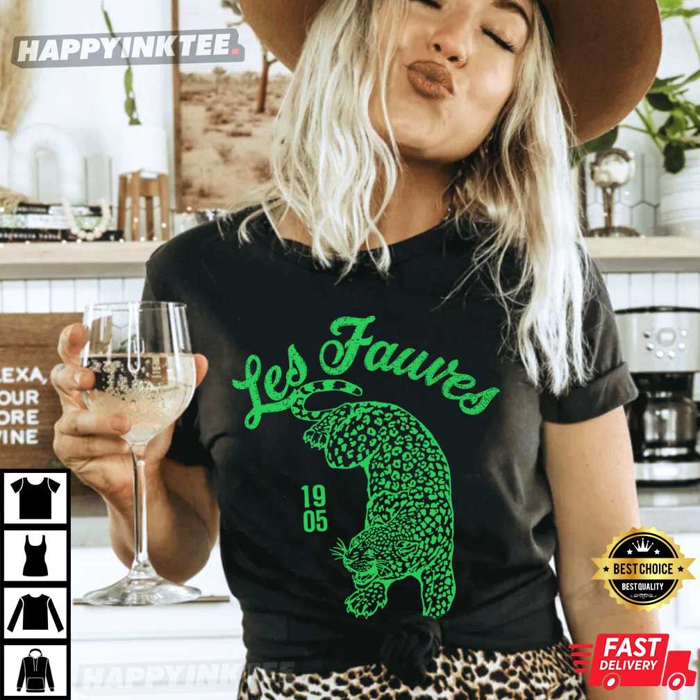 This Les Fauves Duran Duran Vintage Leopard T-Shirt is inspired by the classic vibe of Simon Le Bon from Duran Duran. It evokes a vintage aesthetic that aligns with the band’s bold stage presence. The design shows a leaping leopard in green, along with “Les Fauves” (French for “The Wild Beasts”) and the year “1905.”