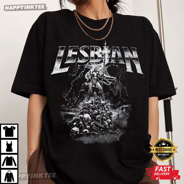 This Vintage Lesbian shirt shows off a cool illustration of a fantasy warrior queen standing proudly on a pile of skulls, with “Lesbian” written in a bold, heavy metal-style font above her. It’s a cool mix of dark fantasy art and bold identity, great for anyone who loves strong female characters, vintage vibes, and wants to make a statement.
