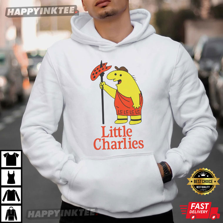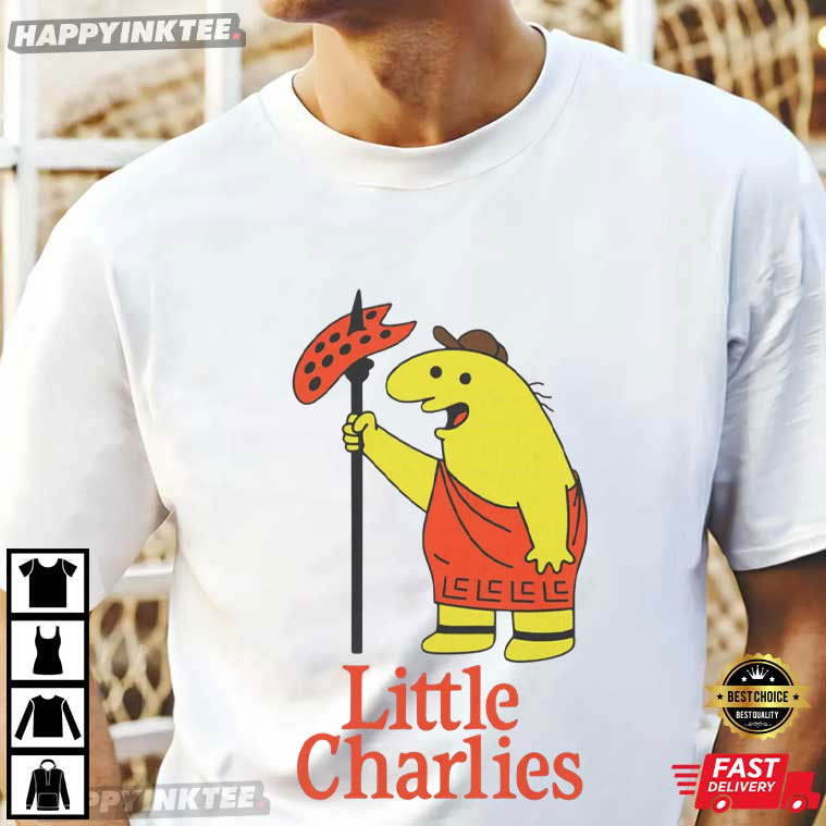 This Little Charlie’s Funny Meme Cartoon T-Shirt is excellent for you if you like clothes that get people talking and laughing. A bright yellow cartoon character called “Little Charlie” is clutching a silly spear with a red shape on top of it. Little Charlie wears a toga-style costume and plain shoes. He has the same awkward, odd look that has made other cartoon creatures become viral on TikTok, Instagram Reels, and Reddit meme threads.