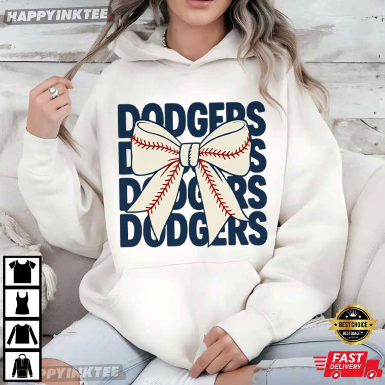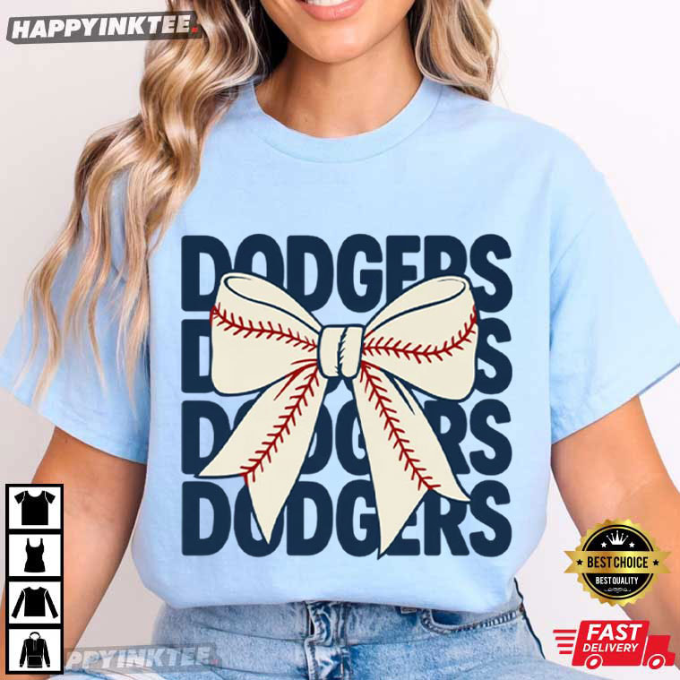 The Los Angeles Dodgers Baseball Bow T-Shirt is a stylish and playful way to represent one of the most iconic teams in baseball. Combining sporty pride with a cute fashion twist, this design features a baseball-themed bow layered over bold lettering that repeats the name of the legendary Los Angeles Dodgers — For baseball enthusiasts who like to express their love for the game while still dressing stylishly and fun, this is the ideal combination of team pride and modern casual design.