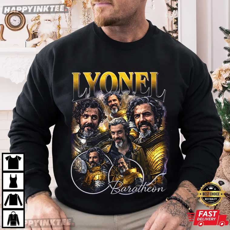 If you love dramatic fantasy aesthetics, oversized 90s graphics, and legendary house energy, the Lyonel Baratheon Seven Kingdoms Movie Bootleg T-Shirt combines nostalgia with a touch of medieval ferocity. This Lyonel Baratheon Seven Kingdoms shirt channels the commanding presence of Lyonel Baratheon, styled as a noble warrior of the Seven Kingdoms — powerful, strategic, and regal. It feels like a rare vintage convention tee from the heyday of fantasy fandom, with its big gold “LYONEL” headline and dramatic collage of armored images.