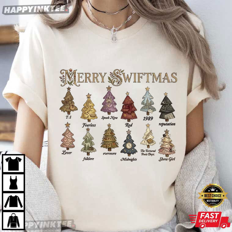 This Merry Swiftmas Christmas Tree Eras Album Music Lover Xmas T-Shirt will let you celebrate the holidays the Swiftie way, featuring a series of Christmas trees inspired by each iconic album era. Every tree carries its own personality—warm gold for Fearless, dreamy lavender for Speak Now, bold red tones for Red, icy blue for 1989, dark drama for Reputation, and the soft, woodland hues of folklore and evermore. Printed on a soft, comfortable fabric, it’s perfect for layering under winter cardigans or wearing casually throughout the holiday season.