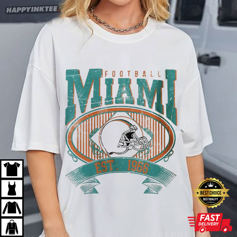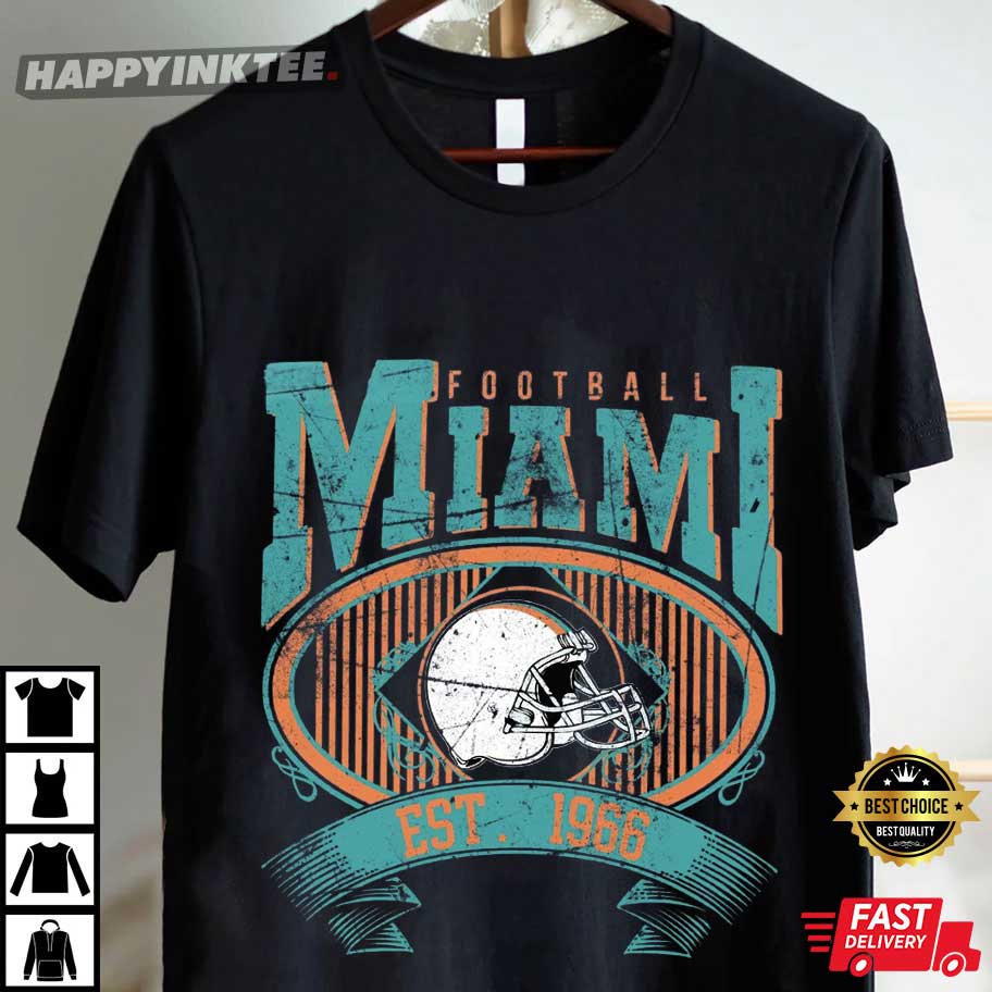 This Miami Football Vintage 1966 T-Shirt is a tribute to the team’s history. It has bright teal and orange hues, and a traditional football helmet graphic. It embodies the essence of Miami’s football history since 1966.