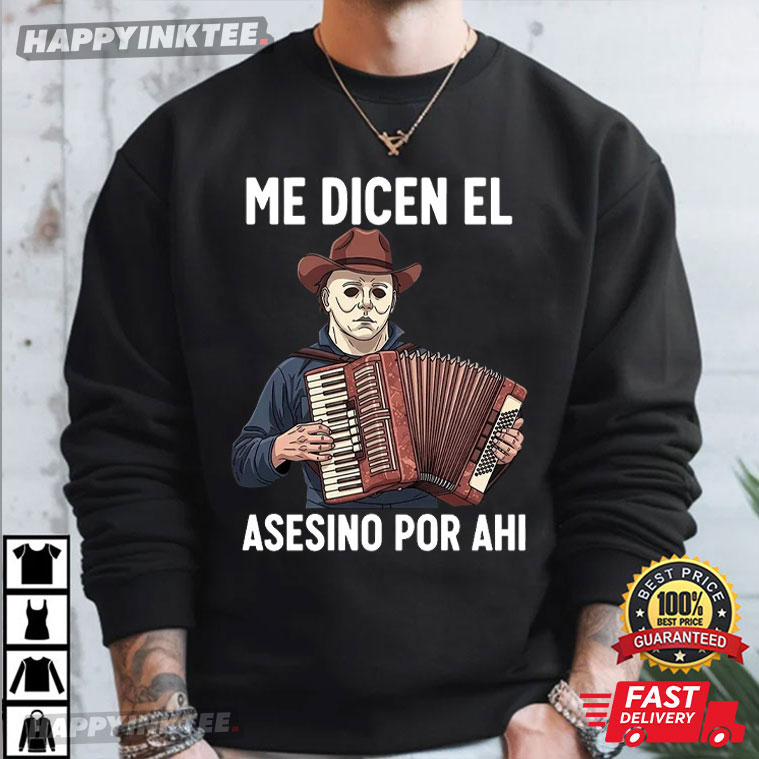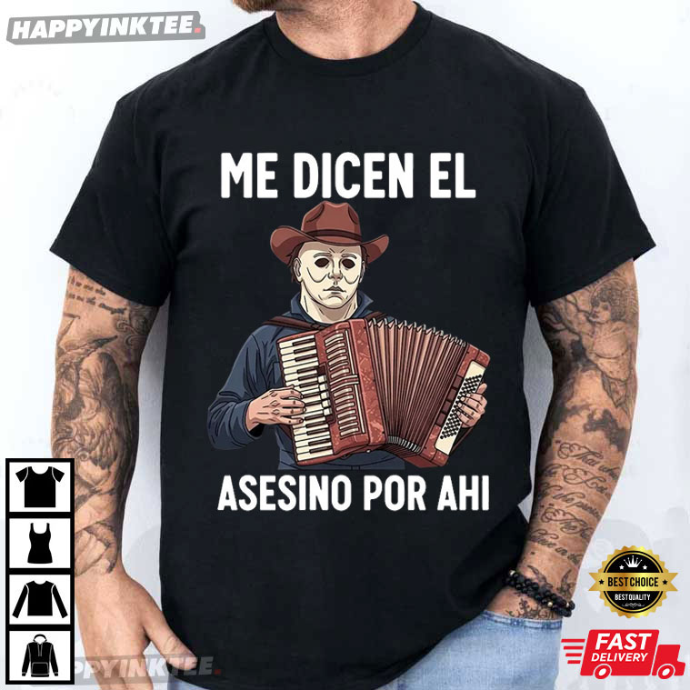 The phrase ‘Me Dicen El Asesino Por Ahi‘ is Spanish for ‘They Call Me The Killer Around Here.’ It’s pretty funny to think about that spooky line paired with a well-known killer like Michael Myers jamming on an accordion. The accordion is a well-loved instrument in Mexican and Latin American folk music, like Norteño or Cumbia. This funny horror shirt is a clever way to show your love for horror movies with a bit of a funny, cultural twist.