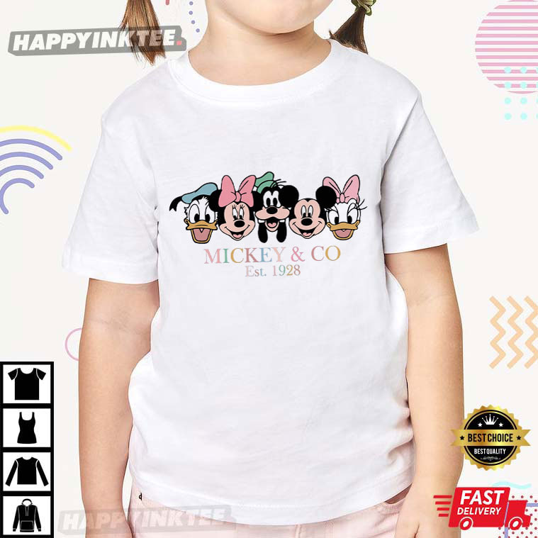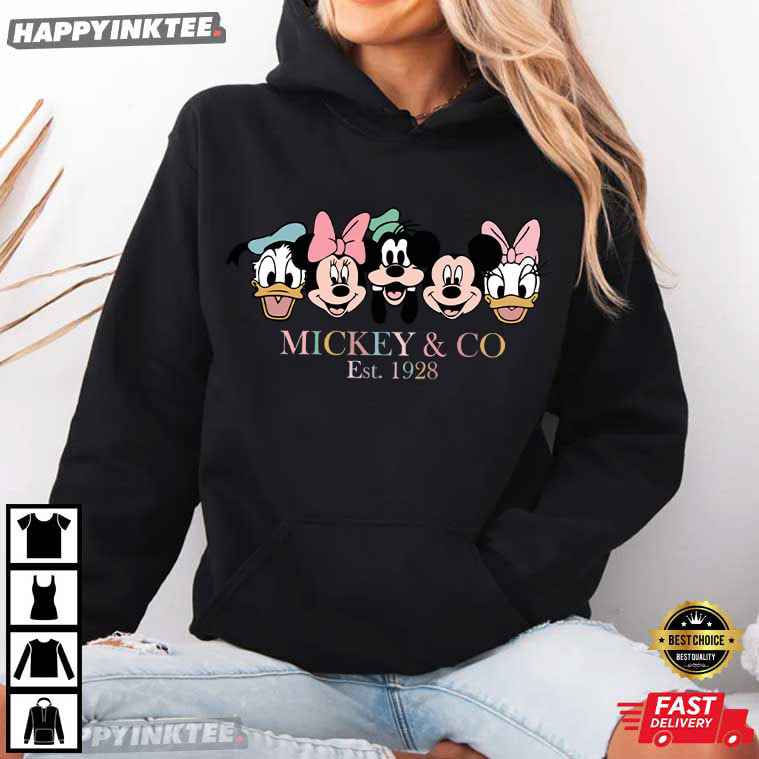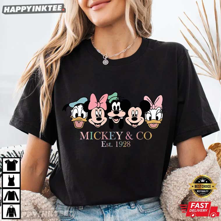 The design is anchored in Disney history with the words “Mickey & Co – Est. 1928,” which alludes to the year that Mickey Mouse made his debut — The soft pastel colors on a classic black tee create a balanced look that feels both vintage and modern, making it easy to wear while still full of meaning.