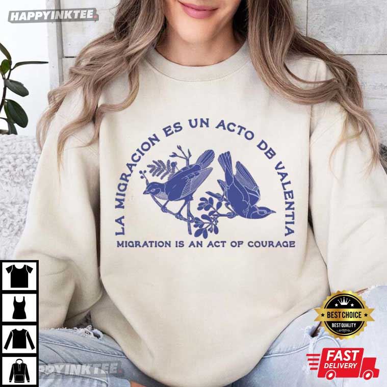 This Migration Is An Act Of Courage Human Rights T-Shirt has an illustration of two birds chilling on branches, and it comes with a message in English and Spanish. It features “LA MIGRACION ES UN ACTO DE VALENTIA” in a cool arc at the top, and “MIGRATION IS AN ACT OF COURAGE” at the bottom. The two-language method really broadens its appeal and vibe of inclusivity.