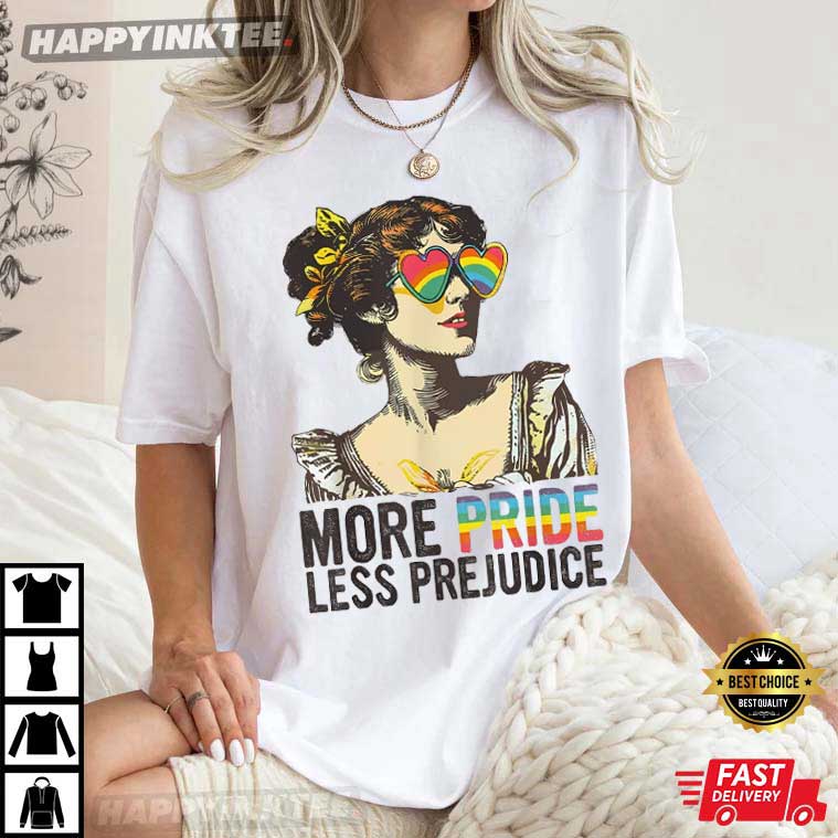 Rock this More Pride Less Prejudice LGBTQ Proud Ally T-Shirt and show off your love and pride! It has a vintage portrait wearing rainbow heart sunglasses and bright pride-inspired text, making a strong statement for equality and acceptance.