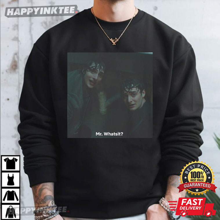 The Mr. Whatsit Will and Mike Stranger Things Dark Photo T-Shirt shows one of the most scary and heartbreaking scenes from Stranger Things, when fear, loyalty, and the unknown all come together. The design has a dark, low-light still of Will Byers and Mike Wheeler, who are both wet and tired, along with the creepy caption “Mr. Whatsit?” This sentence immediately brings fans back to the show’s darker, more psychological sequences.