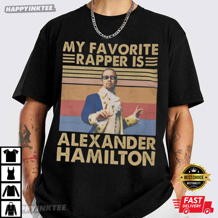 Show some love for one of Broadway’s legendary characters with the My Favorite Rapper Is Alexander Hamilton T-Shirt. It’s got a cool retro vibe with Alexander Hamilton rocking his Revolutionary War uniform and some stylish sunglasses for that modern rap flair.