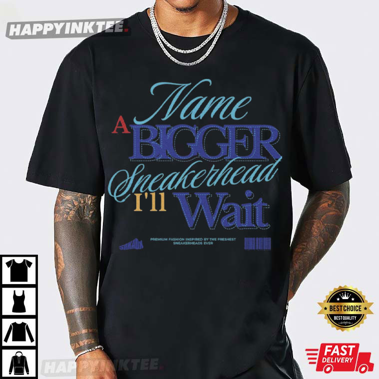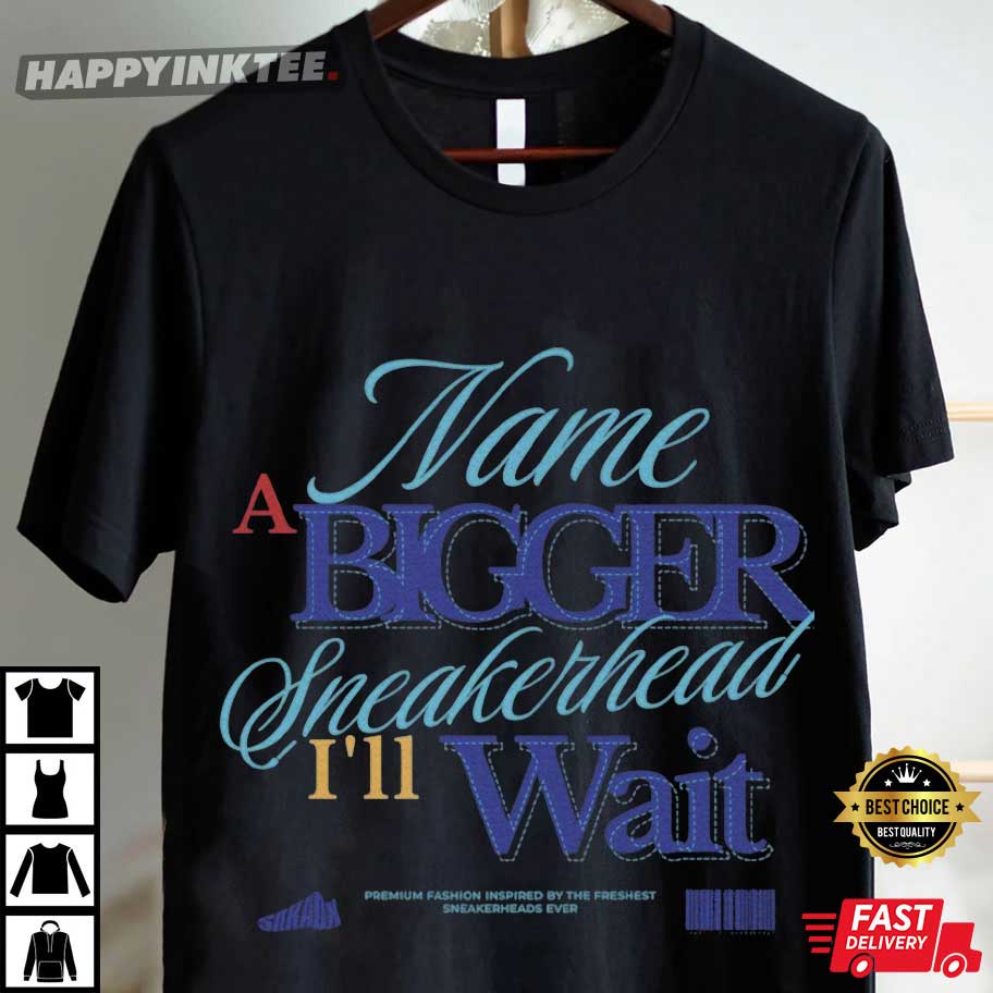 Get the Name A Bigger Sneakerhead T-Shirt to step up your sneaker game. It’s the perfect match with your Air Jordan 8 Aqua sneaker. It is ideal for fans all over the world because it has a stylish, big graphic that says “Name A Bigger Sneakerhead, I’ll Wait.”