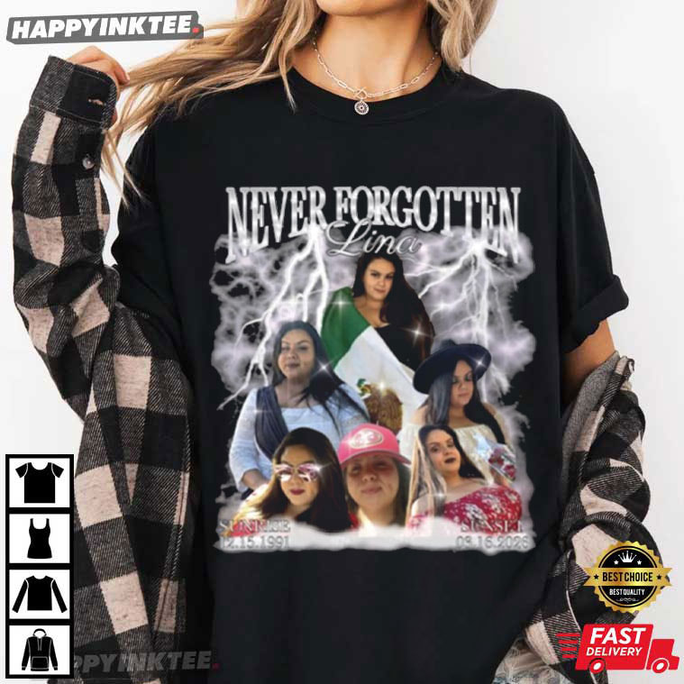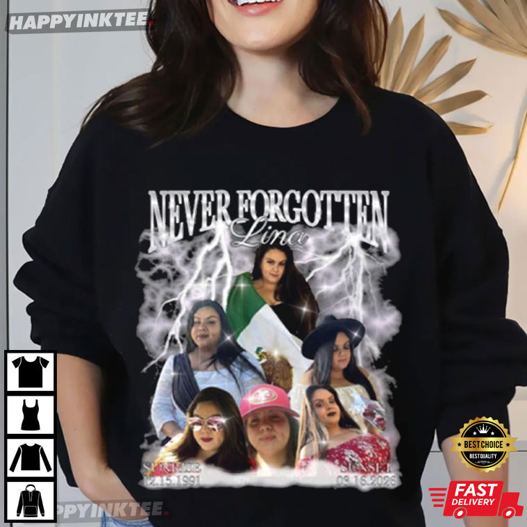 With our Never Forgotten Bootleg Graphic Custom T-Shirt, you can honor and remember—this powerful design features a striking collage-style graphic with the bold text “NEVER FORGOTTEN Lina” above a dramatic cloud of lightning and smoke — At the center are portraits of several women, including Lina, surrounded by glowing effects and names with meaningful dates: Sunnee (12.15.1991) and Susa (03.16.2026).