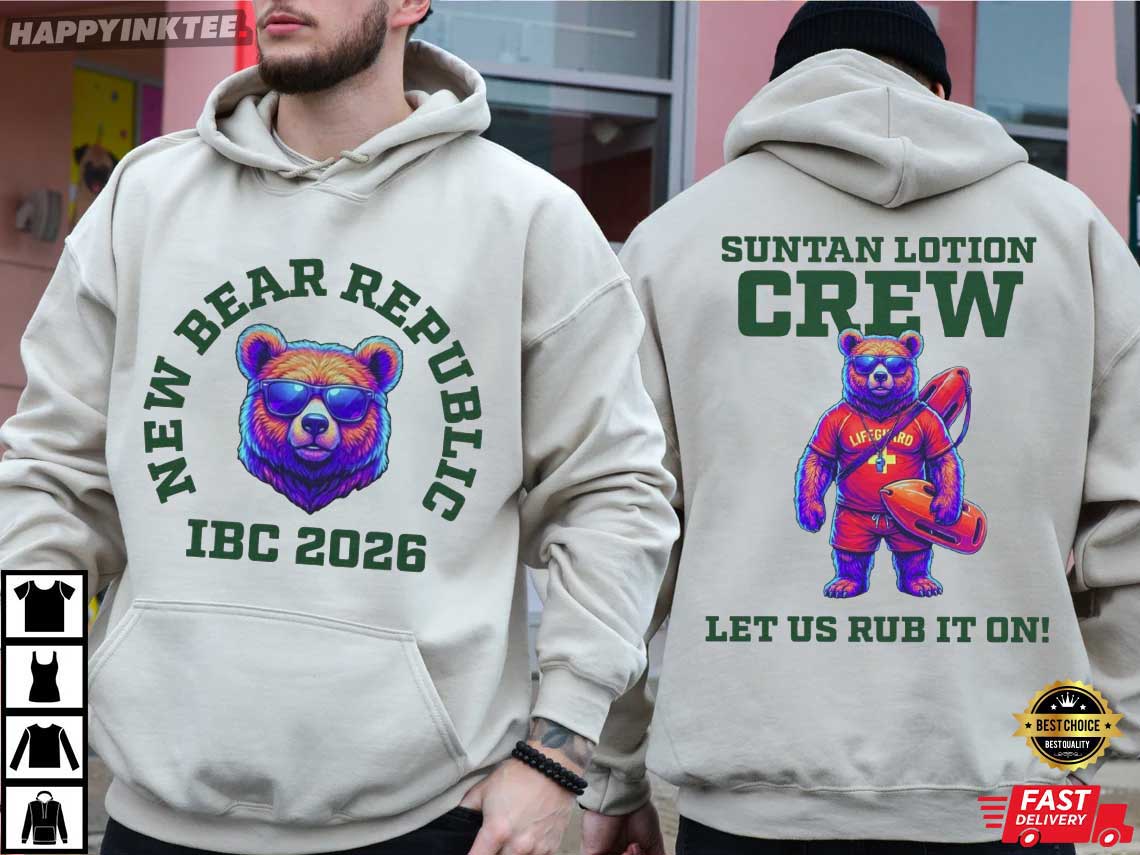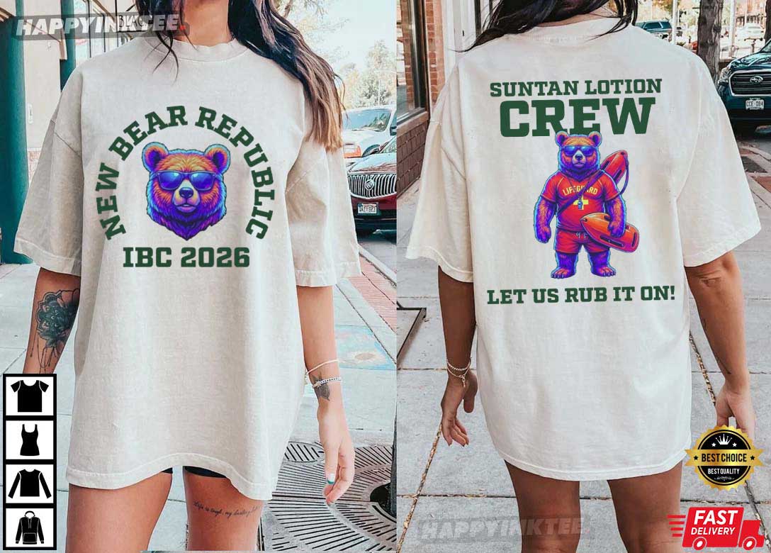 The New Bear Republic IBC 2026 Suntan Lotion Crew T-Shirt is for folks who don’t take summer or themselves too seriously. This shirt has vivid artwork on the front and back that combines fun satire, event pride, and beach culture into a design that catches the eye and gets people talking right away.