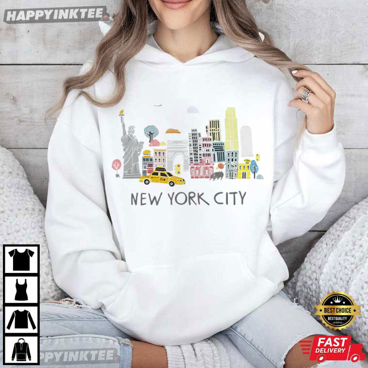 Bright, charming, and instantly recognizable, the New York City NYC Skyline Landmarks Tourist Souvenir Gift T-Shirt captures the heart of the city in a playful, illustrated style. Designed for travelers, dreamers, for lifetime New Yorkers, this New York City t-shirt is simple, happy, and packed with classic elements, making it feel like a postcard you can wear.