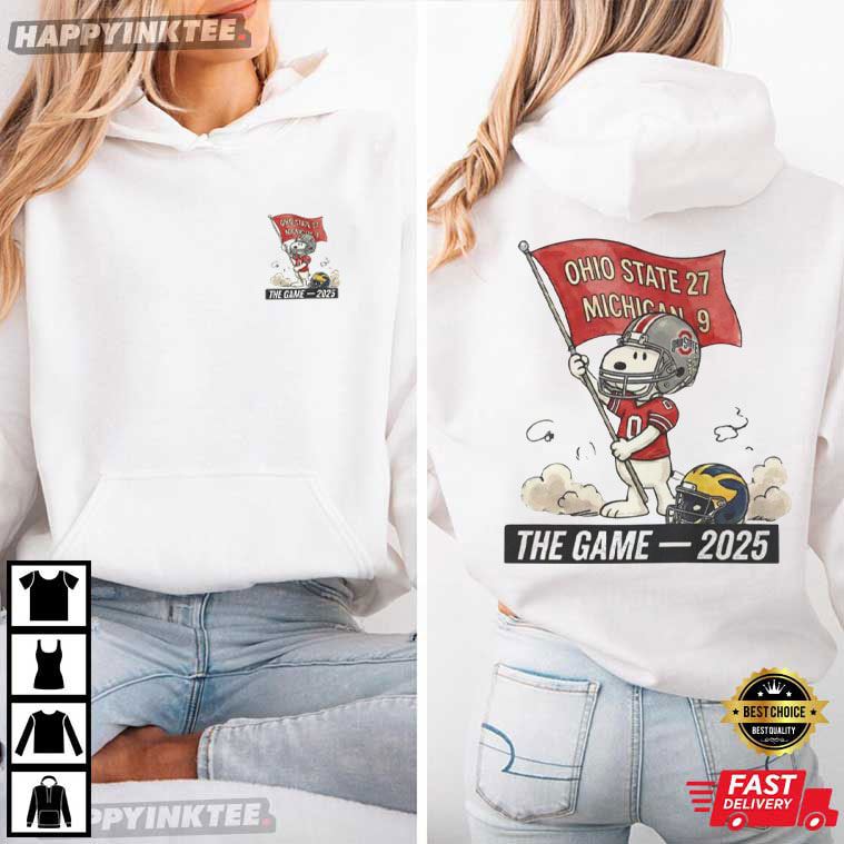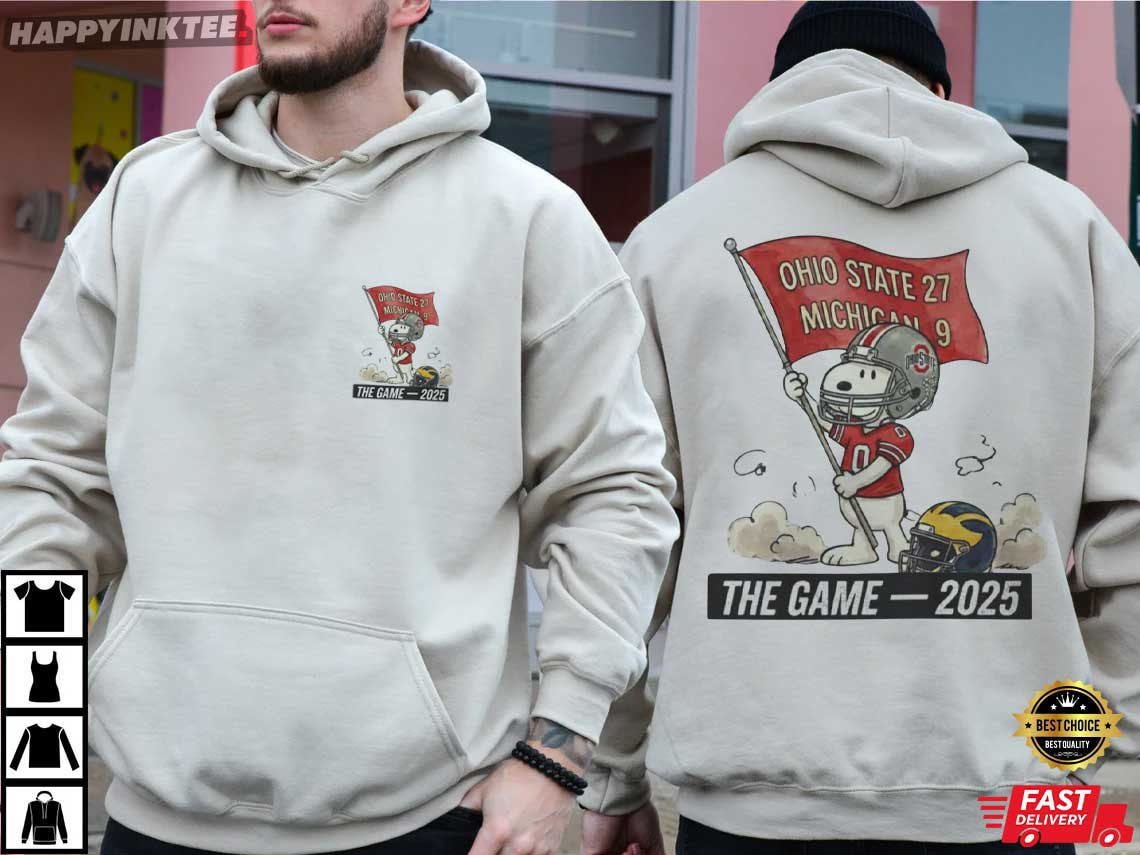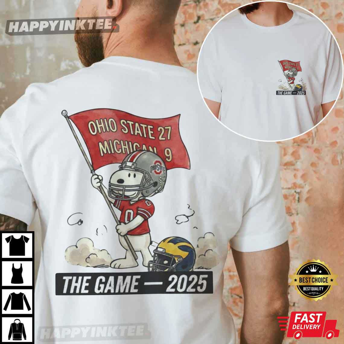 This Ohio State Buckeyes 27 Michigan 9 The Game Football T-Shirt will let you celebrate rivalry week in style. The design features a cartoon football character proudly waving a red victory flag with the score Ohio State 27 – Michigan 9, standing beside a tossed Michigan helmet. Whether you watched it at home, partied at a tailgate, or simply love the rivalry, this Ohio State vs Michigan T-shirt lets you rep the win in a lighthearted, stylish way.