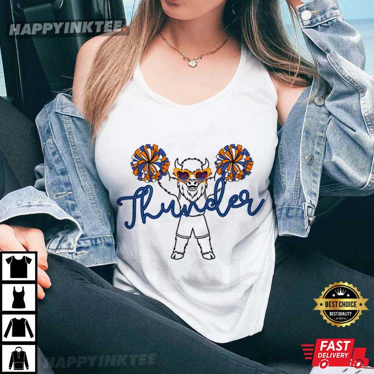 If you are familiar with Oklahoma City basketball, you are aware that the intensity extends beyond the court—it’s in the crowd, the chants, and yes, even the mascot.This design makes that spirit come to life in an enjoyable, lighthearted manner, featuring a cheerful buffalo character rocking heart-shaped sunglasses and holding pom-poms high, ready to hype up the crowd.