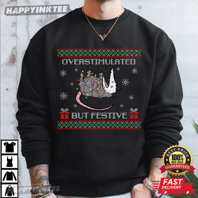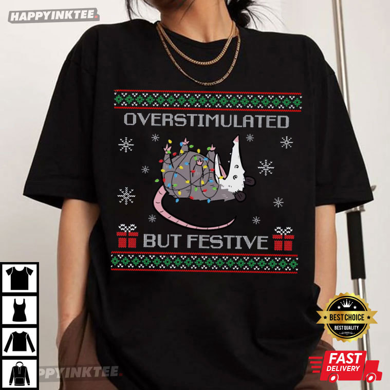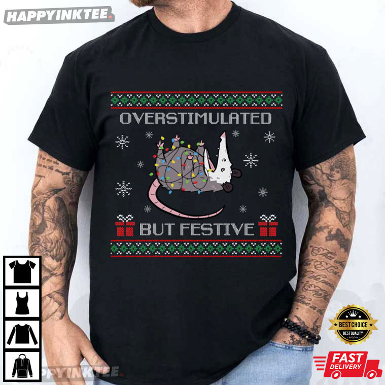 Overstimulated But Festive Possum Meme Ugly Christmas T-Shirt
