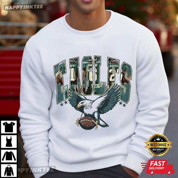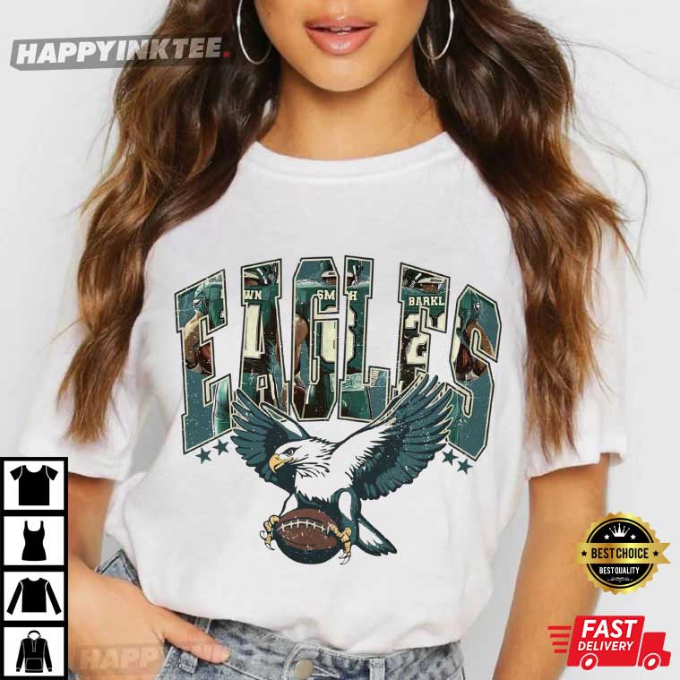 The Philadelphia Eagles Football Bird Gang T-Shirt is the best shirt for die-hard Eagles fans. Wear it to show your Philly pride! It has a big EAGLES design with famous players inside the letters and the eagle holding a football.
