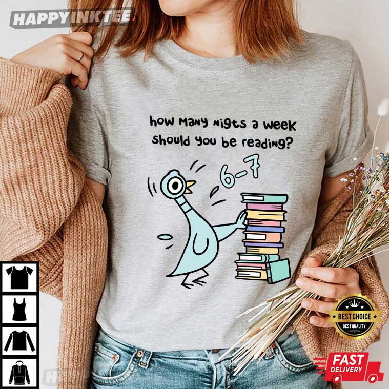 This Pigeon 67 Reading Book Lover Librarian T-Shirt is the perfect mix of charming and smart for people who love books or know a teacher or librarian with a fantastic sense of humor. There is a cartoon pigeon with big eyes holding a towering stack of colorful books, along with the amusing question, “How many nights a week should you be reading?” And the answer is? “6–7.”